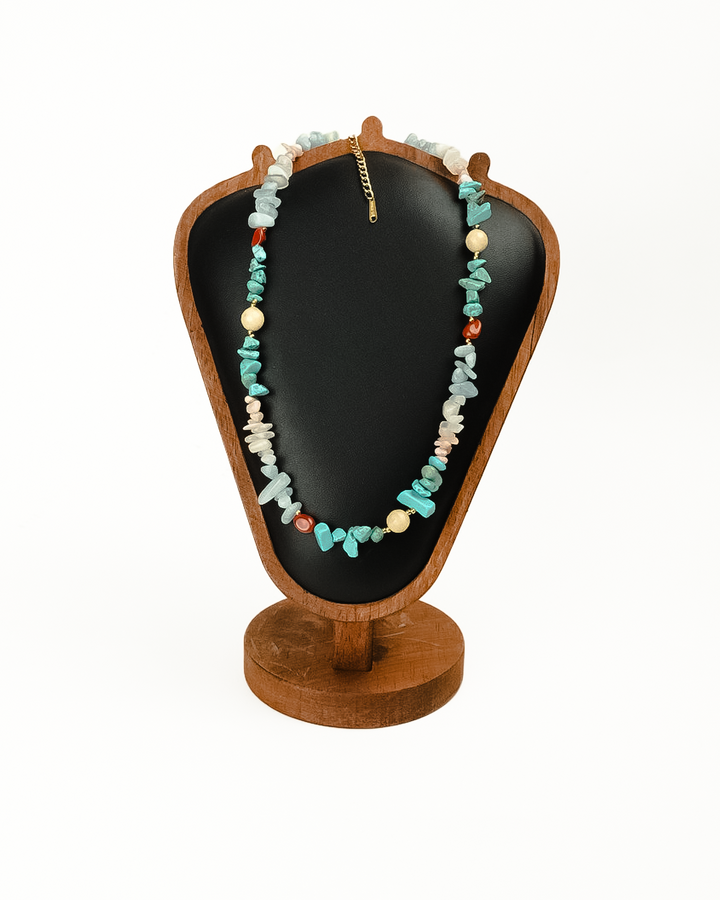 - Turkuaz taşı, mercan taşı, krem akik taşı, aquamarin kırık doğal taş, kırık opal taşı ve çelik ara malzeme kullanılmıştır.